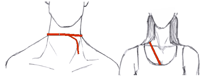 Measure in a slant from the highest shoulder point to the center at the length of the neck you desire. Measured from the same point to the back neck depth.
